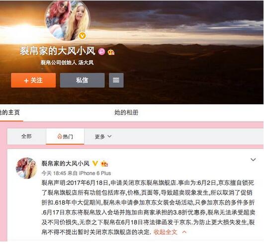 当所有商家都在关心618大促能卖出多少时,裂帛公司创始人汤大风却在618当天发布声明,申请关闭京东裂帛旗舰店。