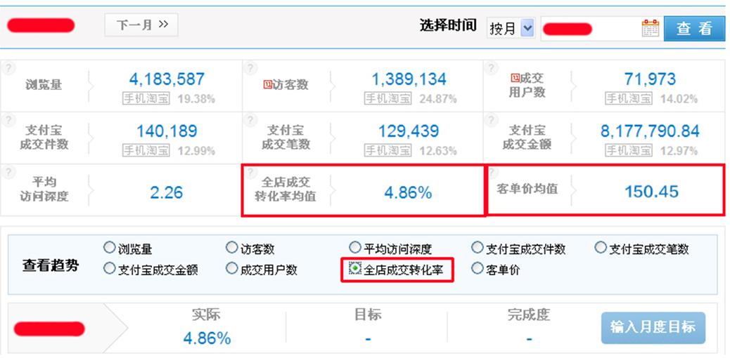 如图4的数据当中,我们可以看到店铺的总浏览量为4183587人,而访客数量为1389134人,利用访客数量除以总浏览量然后再乘以100%,算出了全店成交的转化率为4.86%。当然图片也是为大家举个例子,方便大家理解。我们自己的店铺运营好的话转化率也可以达到一个很高的值。